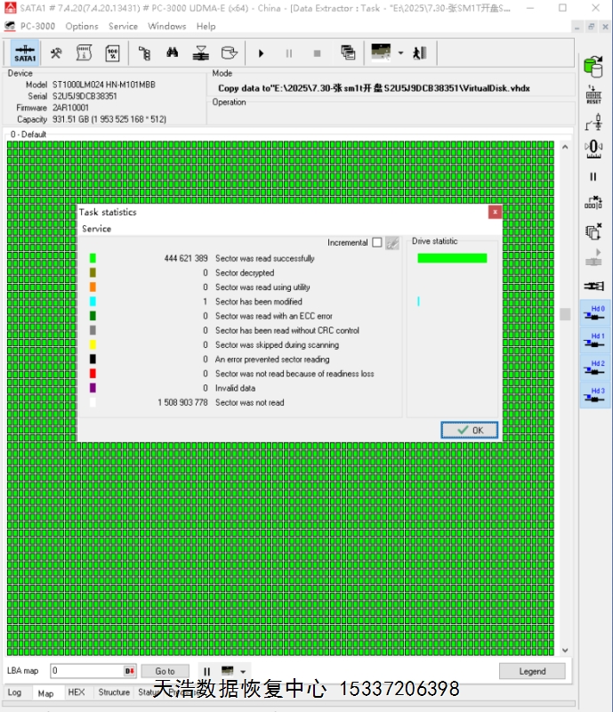解決方案:收到硬盤后,接到專業數據恢復工具PC-3000 UDMA Express上,通電進程序,發現終端不停的跑出錯代碼,這種一般都是有頭不良了,通過虛擬處理,備份好固件,做好鏡像前的準備工作后,DE分頭鏡像,發現1頭壞,先鏡像023面,再在無塵環境更換兼容的磁頭,通電正常認盤,繼續鏡像,最后成功恢復硬盤內幾乎全部重要數據!