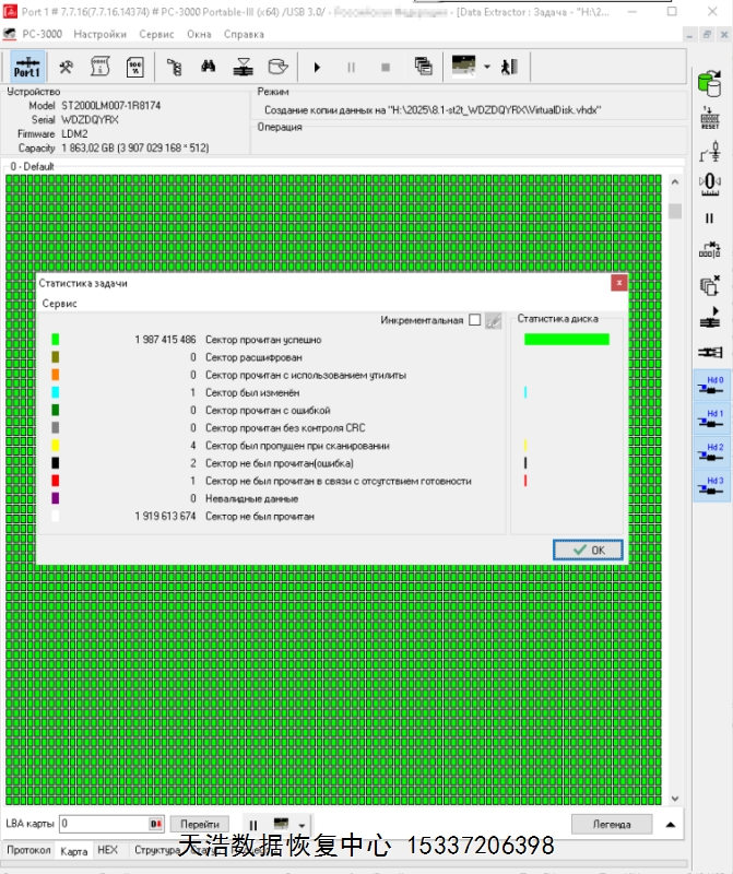 解決方案:收到硬盤后,在無塵環境拆開,更換兼容的磁頭,接到數據恢復工具ACE PC-3000 Portable 3上,通電硬盤正常認盤,做好恢復前的固件備份、處理工作后,DE分頭鏡像,最后客戶硬盤內重要數據基本完美恢復!