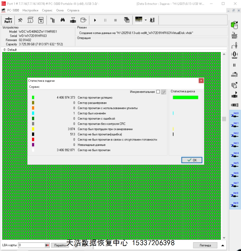 解決方案:收到硬盤后,我們?cè)跓o(wú)塵環(huán)境更換兼容的磁頭,對(duì)原始ROM解鎖,再usb板飛線改SATA,接到專業(yè)數(shù)據(jù)恢復(fù)工具ACE PC-3000 Portable 3上,通電硬盤正常認(rèn)盤,備份固件,做好鏡像前的處理工作后,DE分頭鏡像,最后客戶硬盤內(nèi)2T多的重要數(shù)據(jù)基本完整恢復(fù)!