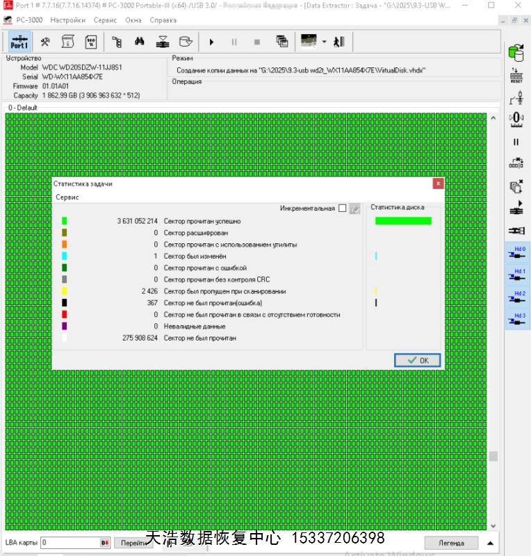 解決方案:收到硬盤后,在無塵環(huán)境更換兼容的磁頭,原ROM解鎖,原始usb板飛線改SATA,接到專業(yè)數(shù)據(jù)恢復(fù)工具ACE PC-3000 Portable III上,通電硬盤認盤,備份好關(guān)鍵固件,做好前期處理工作后,DE分頭鏡像,最后客戶硬盤內(nèi)的重要數(shù)據(jù)基本完整恢復(fù)!