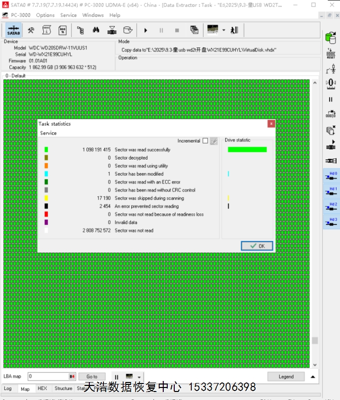 解決方案:收到硬盤后,在無塵環境更換兼容的磁頭,原ROM解鎖,原始usb板飛線改SATA,接到專業數據恢復工具ACE PC-3000 UDMA Express上,通電硬盤認盤,備份好關鍵固件,做好前期處理工作后,DE分頭鏡像,最后客戶硬盤內的重要數據大部分成功恢復!
