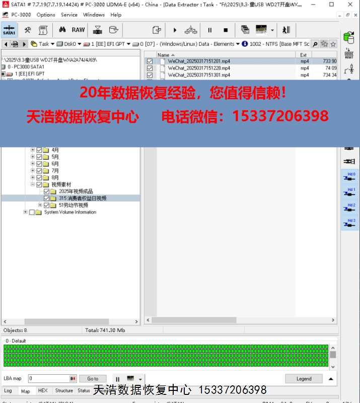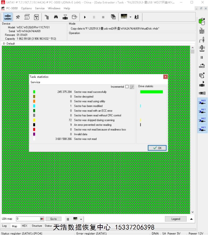 解決方案:收到硬盤后,在無塵環(huán)境更換兼容的磁頭,原ROM解鎖,原始usb板飛線改SATA,接到專業(yè)數據恢復工具ACE PC-3000 UDMA Express上,通電硬盤認盤,備份好關鍵固件,做好前期處理工作后,DE分頭鏡像,最后客戶硬盤內的重要數據基本完整恢復!