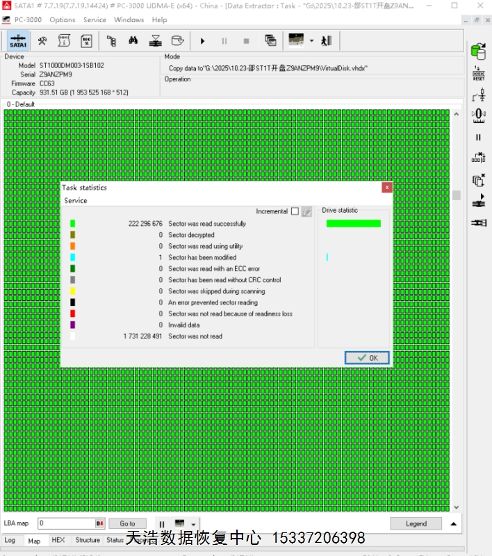 解決方案:收到硬盤后,在無塵環境拆開硬盤,更換兼容的磁頭,接到數據恢復工具ACE PC-3000 UDMA Express上,通電硬盤正常認盤,做好關鍵固件備份和鏡像前期的處理工作后,DE分頭鏡像,最后客戶硬盤內的重要數據完美恢復!