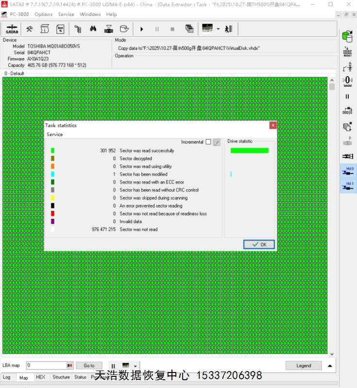 解決方案:收到硬盤后,在無塵環(huán)境拆開,更換兼容的磁頭,接到數(shù)據(jù)恢復工具ACE PC3000 UDMA EXPRESS上,通電正常認盤,DE分頭鏡像,最后客戶硬盤內(nèi)的重要數(shù)據(jù)基本完美恢復。